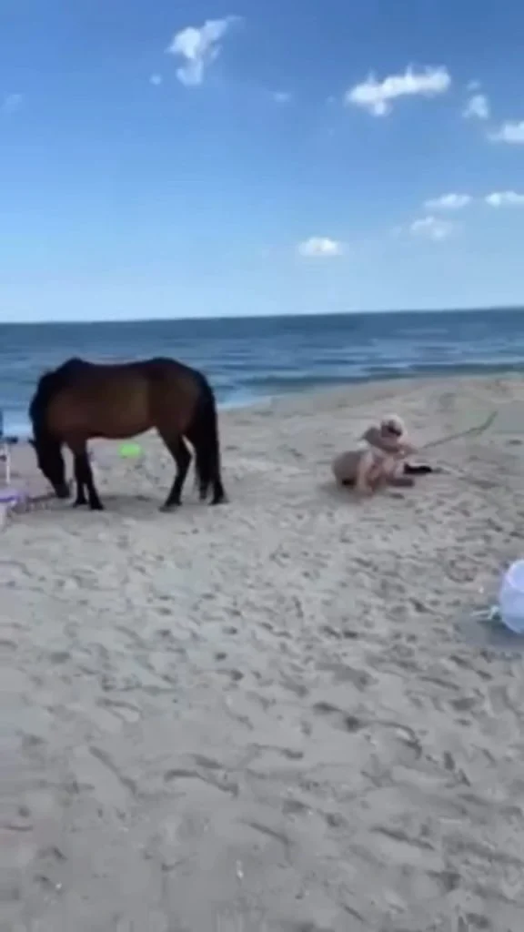 Let’s take this old lady, for example. What was going through her mind when she tried to kick away a wild horse with a kids beach shovel? Whatever it was, the wild beast did not find it the least bit humorous. Imagine, the woman sees a hungry horse snacking on her beachside picnic, so she tries to scare it away. Instead, the woman learns a very important life lesson about aggravating wild animals. And just like that, the animal bucks up and hits the woman’s arm with its powerful kick, sending her tumbling down.